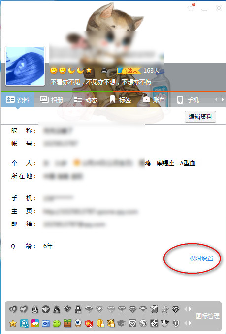 2、进入“个人资料”中,我们点击右下角“权限设置”