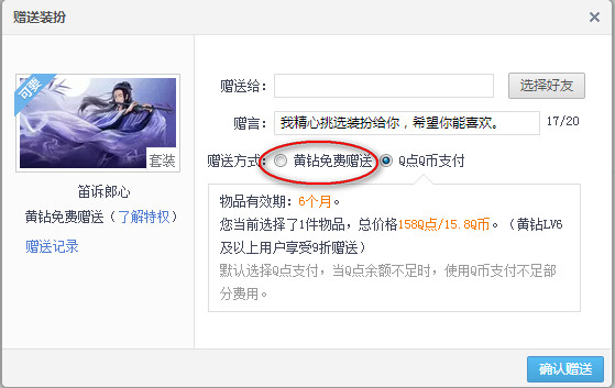 3、接着选择要赠送的好友,并且选择“黄钻免费赠送”项,最后点击“确认赠送”按钮即可。当然,对于装扮的赠送,也支持Q点/Q币赠送方式,这就需要我们去充值了。