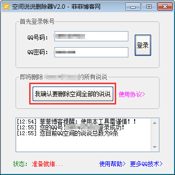 首先在pc6下载QQ空间说说删除器。不过要注意, 这个删除器可能不怎么安全,建议大家在使用前修改密码,或者使用后修改密码。登录你的账号密码,点击“我确认要删除空间全部说说”,确实可以一下删除好多条。