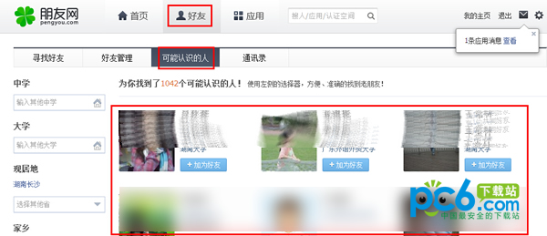 在朋友网首页中,选择好友栏目,再点击人脉,这时可以看到系统为我们推荐的可能认识的好友列表,找到想添加的好友添加即可