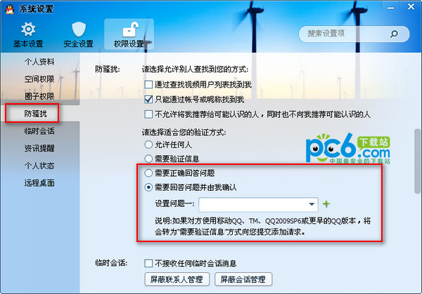 5.在防骚扰设置里的验证方式,也就是别人在添加你的时候的验证方式选择需要正确回答问题或者是正确回答问题并有我审核,这样的话一般人是没有办法添加你为好友的,只有符合条件或者你允许才能加你