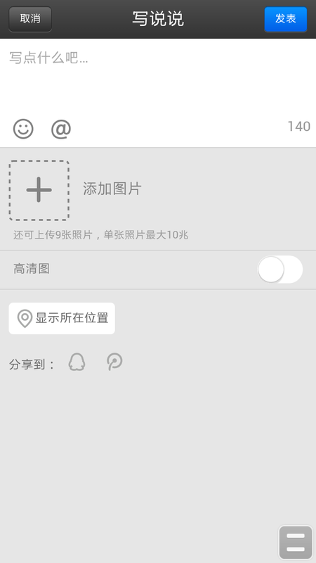 写说说界面,还支持了高清图片的上传功能,多图模式支持9张。表情,@都有哦!