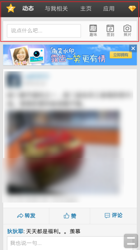 登陆之后的界面,顶部支持发说说,签到照片等等。而“与我相关”被移到了顶部。包括底部的点赞,评论等都是你熟悉的“味道”。