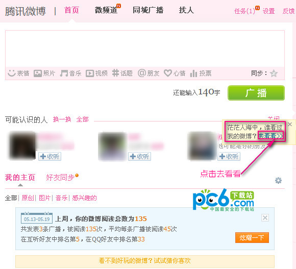 2.在空间打开微博后,中间会有可能认识的人推荐,在推荐人右边会有一个小框显示的是“茫茫人海中,谁看到我的微博?去看看”