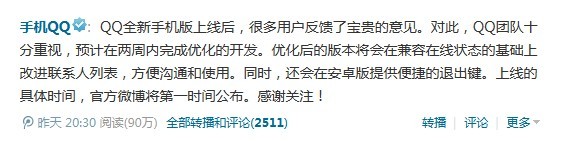 手机QQ团队在其官方微博表示:“QQ全新手机版上线后,很多用户反馈了宝贵的意见。对此,QQ团队十分重视,预计在两周内完成优化的开发。优化后的版本将会在兼容在线状态的基础上改进联系人列表,方便沟通和使用。同时,还会在安卓版提供便捷的退出键。上线的具体时间,官方微博将第一时间公布。感谢关注!”