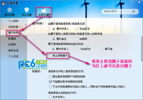 点击QQ界面右下角左边的“主菜单”,然后选中“系统设置”。在“系统设置”里,点击进入“权限设置”,当大家进入隐私设置后,点击“圈子”,然后在“停用圈子”前打勾即可退出圈子了~