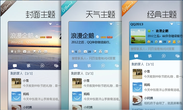首次登录后,系统会弹出一个主题选择界面,QQ2013提供了三款主题:封面主题、天气主题和经典主题。这里我们着重看看新增的动态天气主题。