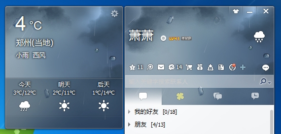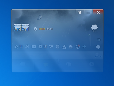 所谓动态天气主题,就是QQ界面皮肤会根据用户所在地的天气情况而改变,并且是动态显示,除了主界面皮肤,所有子窗口也都显示为动态天气。举例来说,笔者目前所在地当前正在下雨,因而QQ当前使用的是雨滴从天空落下的动态皮肤,让人感觉“室内”室外都在下雨。