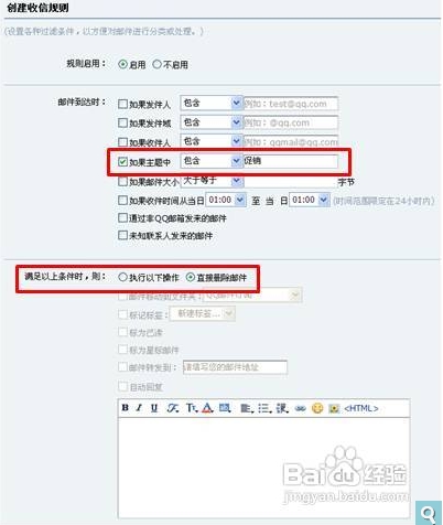 邮件过滤,是对抗垃圾邮件、欺诈邮件的一项非常有效的技术,对于符合过滤条件的邮件进行过滤处理,就如同杀毒软件对病毒的查杀一样。QQ邮箱的收信规则就相当于邮件过滤器,当邮件到达时,你可以根据自己的要求选择相应的条件,并在所选条件的对话框内填入相应的关键字、关键词;这样当条件满足时,QQ邮箱就会根据设置对这些垃圾邮件进行处理。