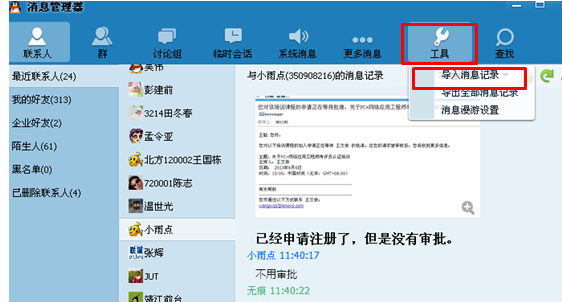 如果我们要导入聊天记录怎么办呢,我们在顶上找到工具,如图。选“导入消息记录”。