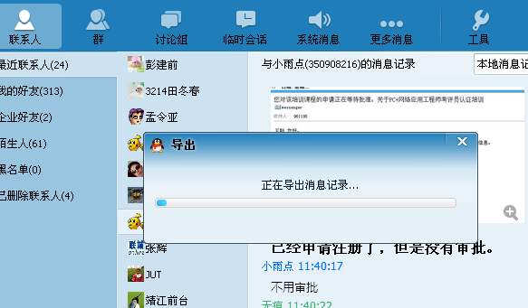 输入完文件名后,点保存,即会出现下面的图片,有一个导出的进度条。100%完成后,聊天记录就全部导出了。