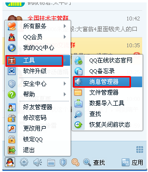 我们点QQ界面的左下角的企鹅标志,点工具-消息管理器。