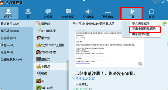 我们可以看到消息管理器的界面,如下,选择右上角的工具,选择导出全部消息记录
