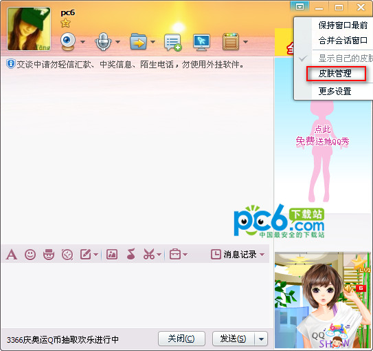 随便选择一位好友聊天即打开聊天框,在最小化左边有一个窗口设置图标,点击选择皮肤管理,后面的步骤与方法一中的第2步一样。