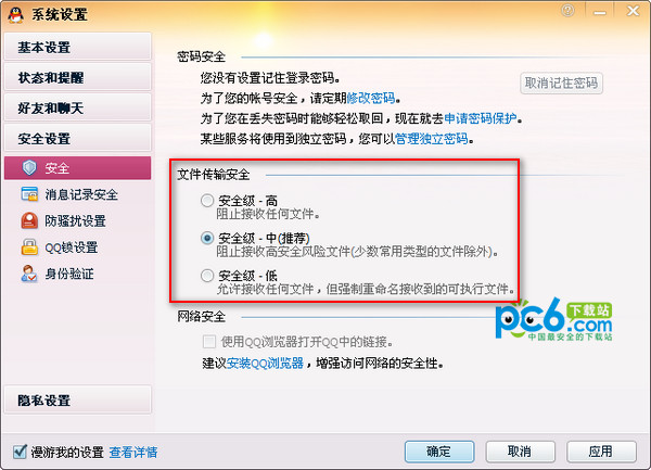 3.检查QQ安全设置,降低安全等级------打开QQ的设置面板,将 “安全和隐私/ 安全 /文件传输安全 ”的级别调到“中”,一般的文件是都可以传的,如果还不行就调到低,什么都可以传了。