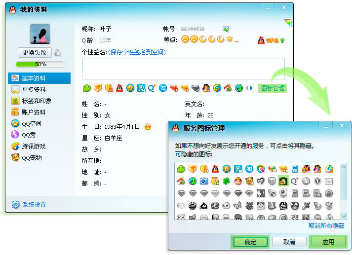 您也可以自行在QQ客户端个人资料卡中设置手动隐藏QQ网购图标,如下图: