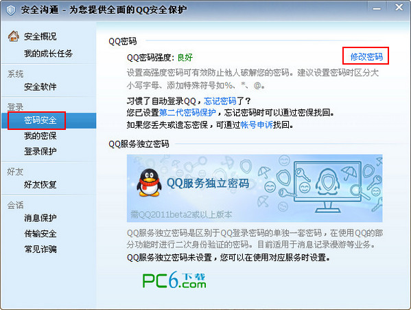 2.qq安全中心打开后,就可以点修改密码来进行密码的更改啦,当然还可以短信改密。