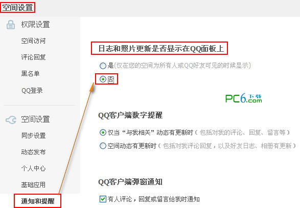 进入空间后选择设置,再选择空间设置---通知和提醒,再把“将QQ空间日志和照片更新显示在QQ上”的勾勾去掉。