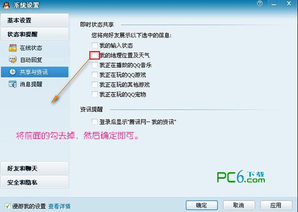 在QQ主版面最下面点击名为“打开系统设置“如图。然后——状态和提醒——共享与资讯。最后点勾或不点就行了。
