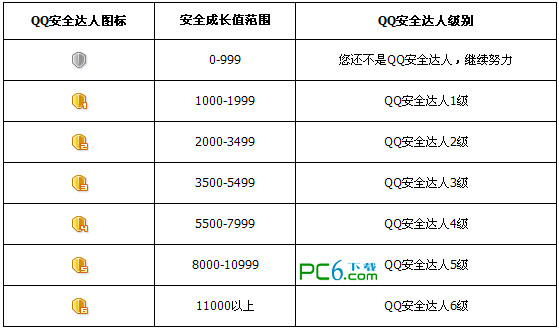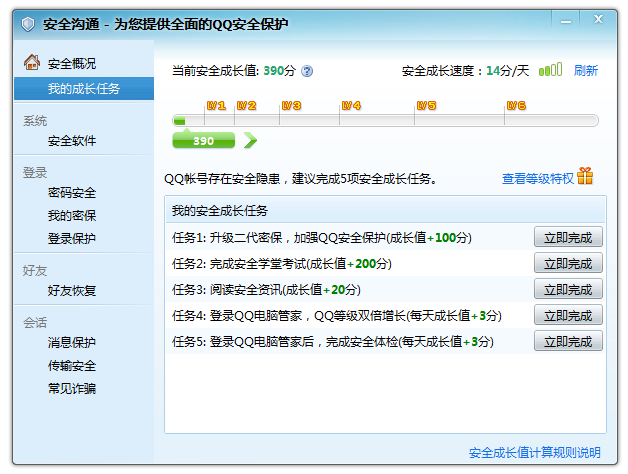 用户通过完成安全任务获得相应的安全成长值,对应不同的QQ安全达人级别,显示相应的QQ安全达人图标。查看安全成长值计算规则说明