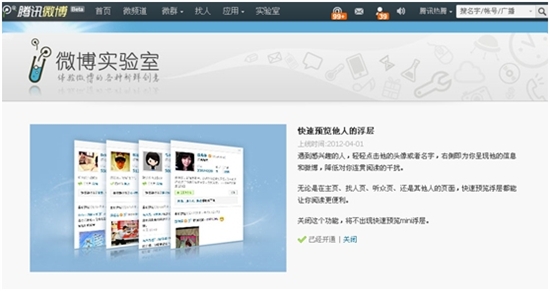 升级换装的腾讯微博增加迷你浮层,帮助你快速预览感兴趣的用户的微博。遇到感兴趣的人,轻轻点击他的头像或者名字,右侧即为你呈现他的信息和微博,降低对你连贯阅读的干扰。无论是在主页、找人页、听众页、还是其他人的页面,快速预览浮层都能让你阅读更便利。