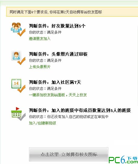 当你达到以上4个条件时,点击下面的按钮,立即拥有QQ校友图标。如果你没有手动点亮,系统也会在第二天自动为你点亮。