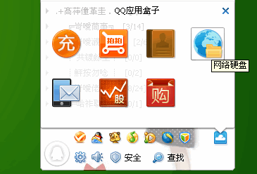 就是点击QQ2011中QQ应用盒子中的那个蓝色图标-网络硬盘。正如下图所看到的,您没有申请QQ硬盘的话,会没有那个黄色的QQ硬盘图标,不过没关系,有上面那个网络硬盘图标也OK——
