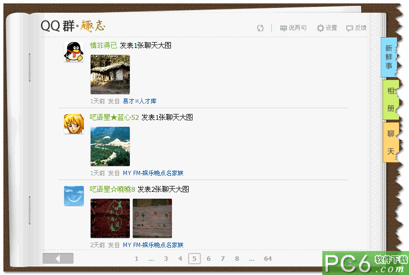 输入自己的QQ号、密码即可使用,群新鲜事主要是查看QQ群中发表的图片以及最近上传的共享文件,可以看见是按照时间的远近对自己所在的所有QQ群的新鲜事进行排列,可以显示具体的发表人的名字,如果是图片的话,点击可以查看大图,进行评论、转载,如果是共享文件的话,点击旁边的下载按钮即可立刻下载。