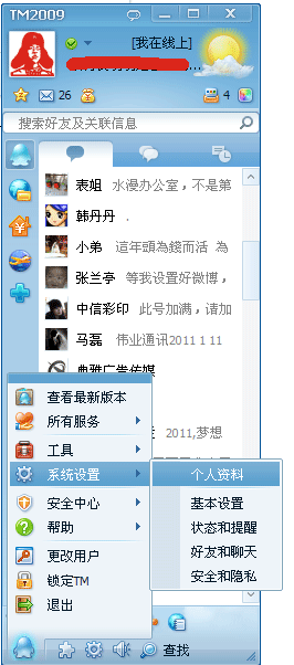 第一步:首先更改QQ网名:登录您电脑上面的QQ聊天工具,再点击点击QQ面板的“主菜单”→“系统设置”→“个人资料”如下图所示: