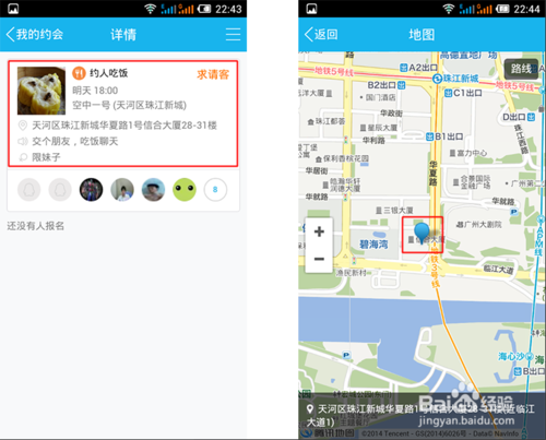 当有QQ附近的人看到你发布的约会信息后,只需进入内容页,即可参与报名约会,同时在详情页可以查看到约会的吃饭地点、时间、地图。
