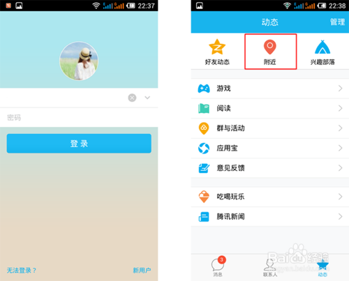 首先打开手机qq登录后先点击—【动态】—【附近】