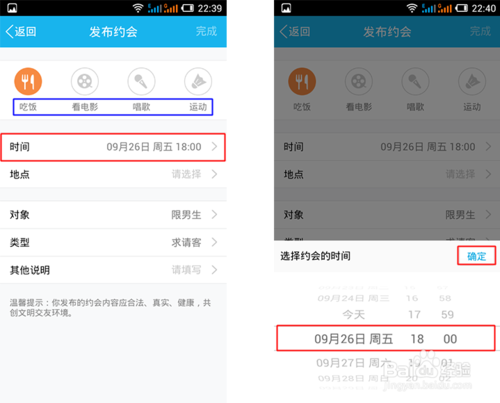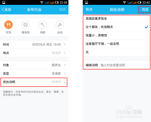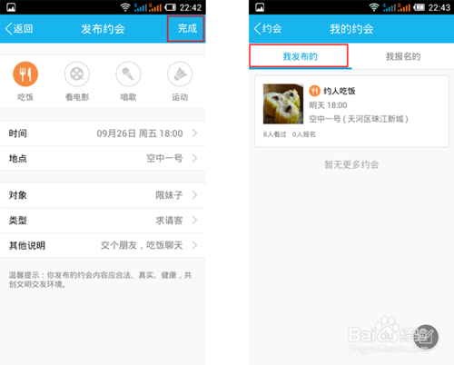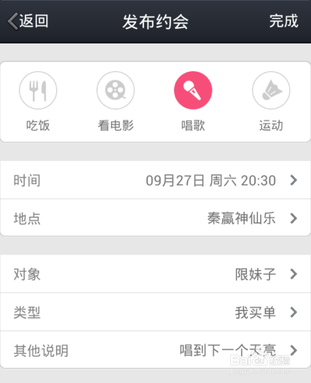 以上内容都编辑完成后,点击右上角的—【完成】按钮即可马上发布约会信息。