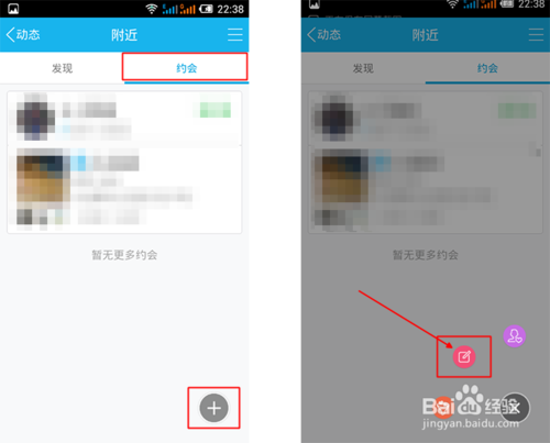 进入附近页面后点击—【约会】在右下方点击—【+号】在弹出的三个图标中选择—【中间的编辑图标】