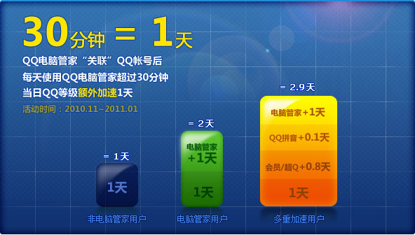 从现在起到2011年1月,使用QQ电脑管家每天只需要使用半个小时以上,就可以等级加速,绝对真实,QQ官方最新活动,QQ会员最多每天可以一天=2.9天,哦,另外使用qq拼音也可以加速QQ升级哦。赶快使用吧,这可以为你节省不少的VIP会员服务费哦,当然使用QQ会员你会得到更好的服务。