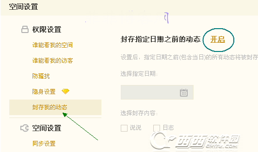 2、然后在“权限设置”下选择“封存我的动态”,如图所示再点击“开启”封存空间动态功能。