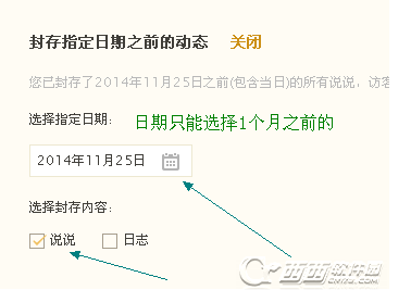 3、最后选择想要封存(隐藏)动态的日期,这个日期必须是1个月以前的,比如今天是12月26号,那么只能封存到11月25号之前的动态。接着在需要封存的内容前打勾就可以了(可以选择说说和日志)。