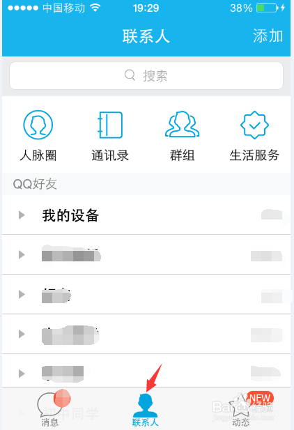 登录你的QQ爱屁屁,找不到QQ悄悄话的给我来,点击联系人图标,看到右上角的生活服务图标。