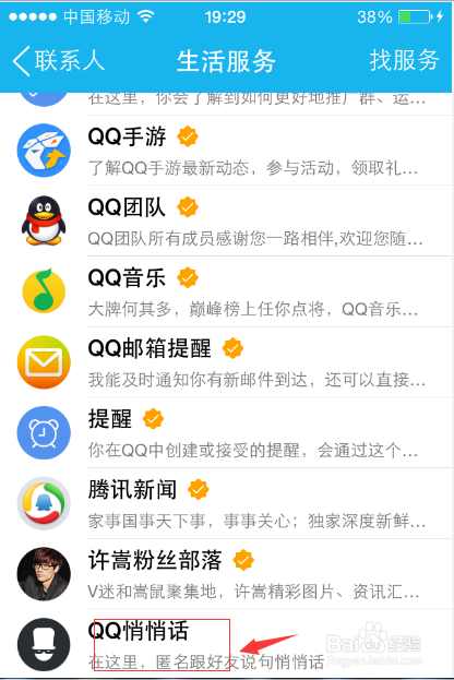 点击打开生活服务菜单,下拉到最后一个,看到QQ悄悄话选项,点击打开。