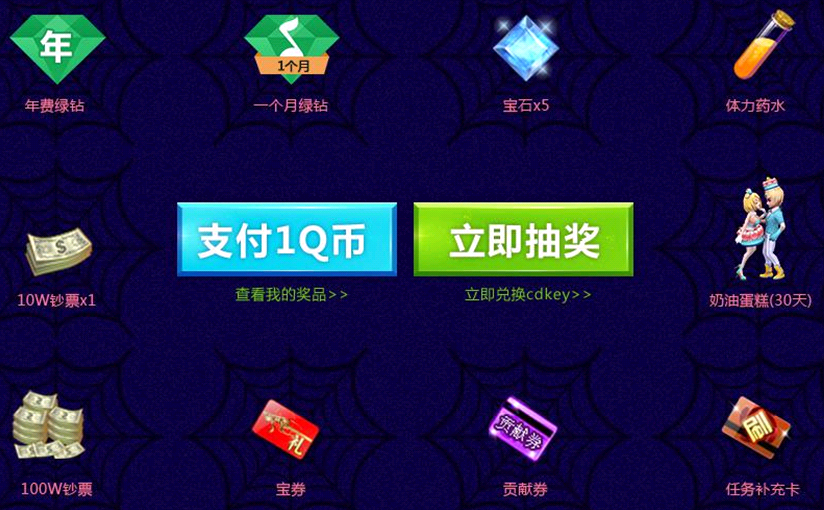 活动奖品:年费QQ绿钻 宝石 钞票 点券 奶油蛋糕 绿钻吧台 绿钻地板 星海启程部件