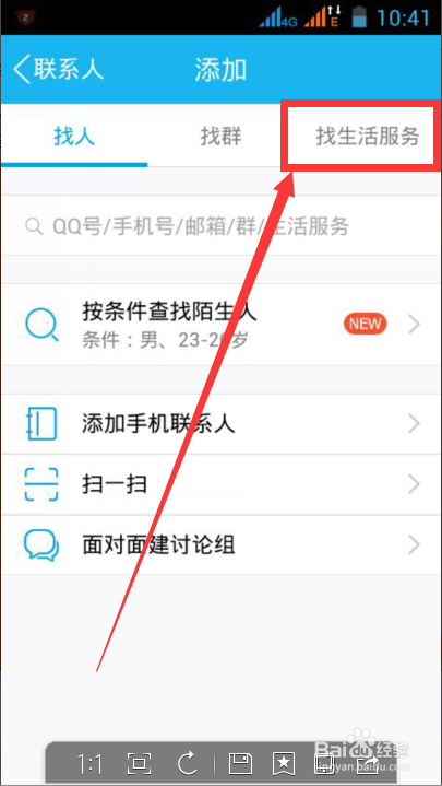 进入之后,找到最右边的“找生活服务”按钮,如下图所示,点击进入。类似于微信里的搜索公众号