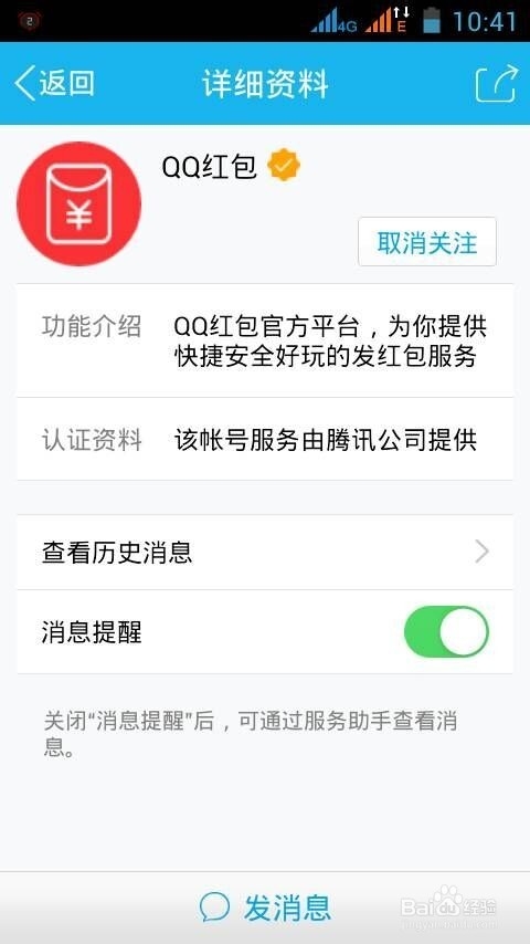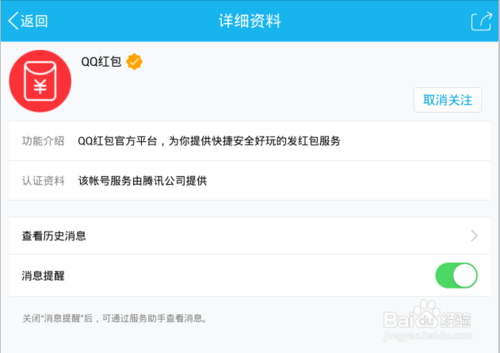 点击关注成功之后,会出现如下图所示的界面,说明已经关注成功了,至此手机QQ 如何查找和添加QQ红包已经介绍完毕,相信大家应该知道该如何查找和添加QQ红包了。