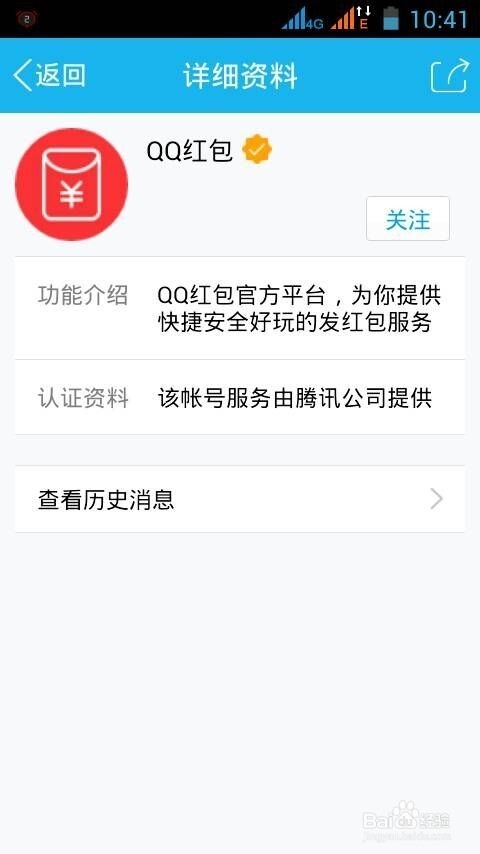 点击进入之后,就会出现如下图所示的QQ红包官方服务号界面,类似于微信里面的服务号,点击关注,进行关注