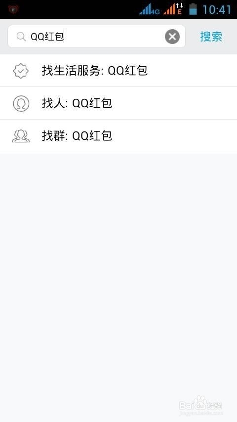 然后在出现的搜索框里输入QQ红包,会出现三个列表,我们选择找生活服务:红包.如下图所示,点击进入。