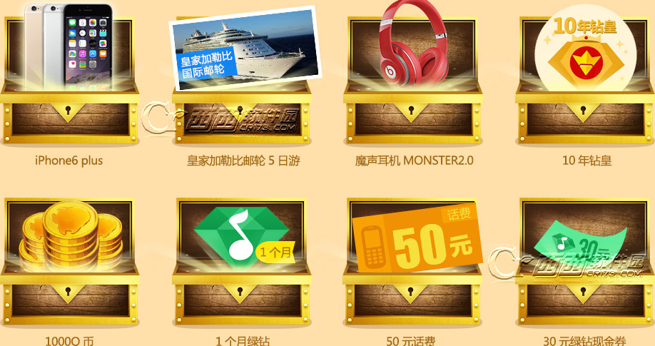 2、活动期间,所有用户均可参与1Q币领宝物活动,支付1Q币即可随机获得1个宝物,宝物包括:iPhone6 plus、皇家加勒比邮轮5日游、魔声耳机MONSTER2.0头戴式耳机、10年钻皇、1000Q币、1个月绿钻、50元话费及30元绿钻现金券。礼品超丰厚,100%有奖,大奖随时降临!快来试试你的运气吧;