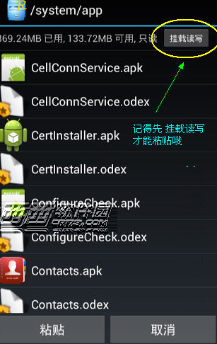 5、在动手安装之前,需要先卸载原版QQ(卸载会清空聊天记录,请注意备份)。然后打开RE管理器,找到 /sdcard(内存卡)目录下的 qq.apk ,长按选择“复制”,再粘贴到 /system/app 目录下(粘贴前确保已经挂载读写权限)。