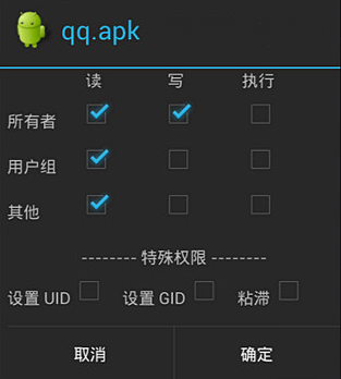 6、还有最后一步很重要,就是修改权限!长按 /system/app目录下的qq.apk 选择菜单中的“权限”,将‘读’下方的三个小勾全打上(如下图),然后退出RE管理器,重启手机。打开手机QQ,久违的QQ启动界面变成了自己私人定制的照片,很个性有木有!