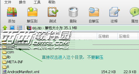 1、下载手机QQ的APK安装包到电脑,然后将其重命名为 qq.zip ,这样就可以使用压缩软件打开它了,再进入里面的 assets目录。注意是双击打开,不要解压哦!