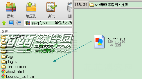 3、准备好一张自己的图片,图片名字也要修改为 splash.png ,分辨率大小最好跟自己的手机一致(默认的是720*1280)。然后将准备好的图片拖拽到刚才打开的压缩软件中(还是那个assets目录下),确定替换即可。