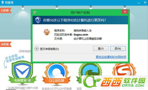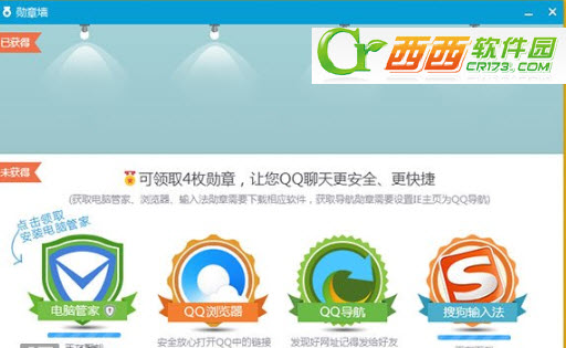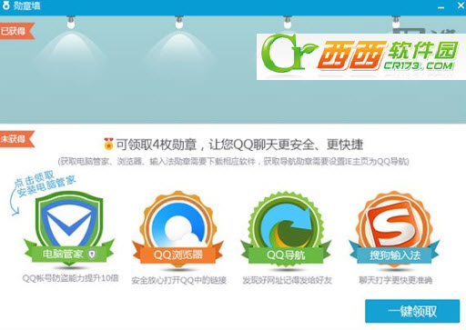 当我们好奇点开这个按钮,原来是腾讯以勋章为名,借机向普通用户推广合作软件,其中覆盖了安全产品、输入法、网址导航以及浏览器四枚勋章。如果要收集四枚新勋章,那你前提必须在本机上安装运行四款产品。
