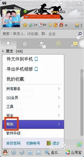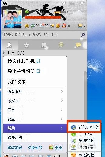 点击帮助以后会出现侧拉菜单,然后在侧拉菜单上面点击我的qq中心,如图所示: